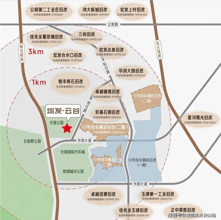 项目3公里范围内已云集约16个城市更新项目,紧邻光明区建区以来规模最大的巨无霸旧改——轨道13号线车辆段旧改(华润+宏发开发,一期2023年底入市),商业居住办公一体化,未来将被打造成为光明区西部片区新中心
