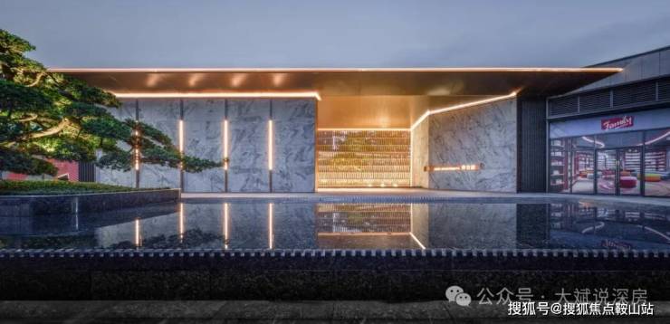 主入口依靠回龙河畔,在开敞式迎宾前广场设置跌水景观,结合名贵树种罗汉松,让尊崇出入道是寻常;超30m门庭设计,以仿古代照壁之手法,精选浪淘沙天然石材与古铜型材,尽显当代精奢雅致气质,演绎独属于东方门第的尊崇仪式。