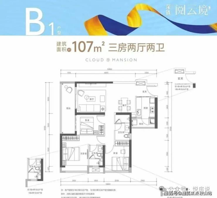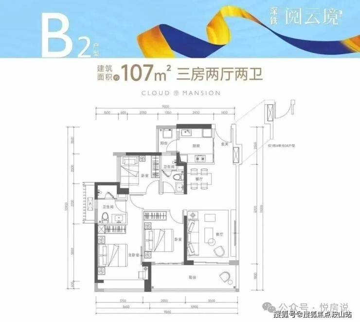107㎡的3房2厅2卫(B2户型,1栋4单元03/04户型)设计的是竖厅格局,进门独立玄关,客厅3.5米开间,LDKB一体化设计,动静分区,3个卧室分别做到了3.15米/3米/2.5米的宽度,客厅连接次卧出5.9米长的大阳台,二字型厨房还带1个小生活阳台。(深铁阅云境)官方售楼处电话:400-8651-207,营销中心_tel:400-865-1207,开发商售楼部热线400-865-1207(开发商认证)电话。提前预约看房尊享额外优惠!