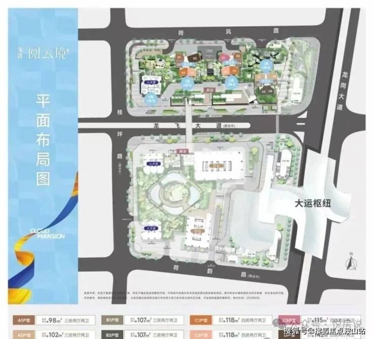 深铁阅云境广场,作为大运交通枢纽上盖物业,总占地面积约5.66万㎡,总建筑面积约51万㎡,以龙飞大道为界共分南北2期开发,有空中连廊相连,北区建设住宅小区,南区兼顾了公共性和便捷性,主要规划超高层办公写字楼和大型商业mall。
