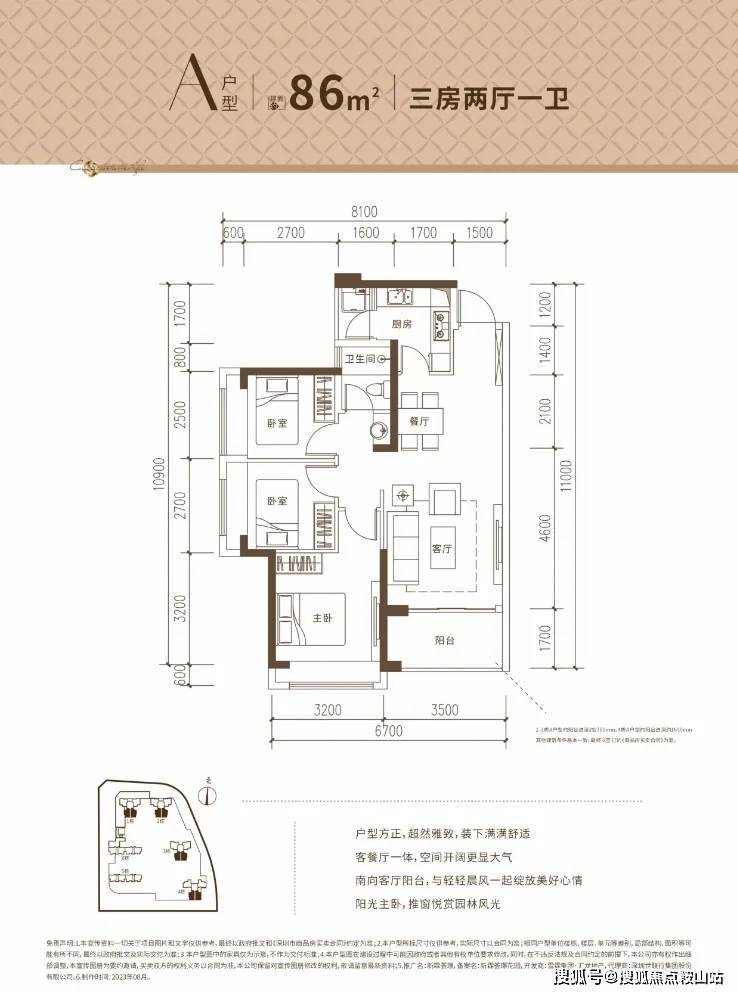 86㎡的3房2厅1卫,设计的竖厅格局,客厅3.5米开间,L型厨房,卫生间三段式分离,正南朝向。