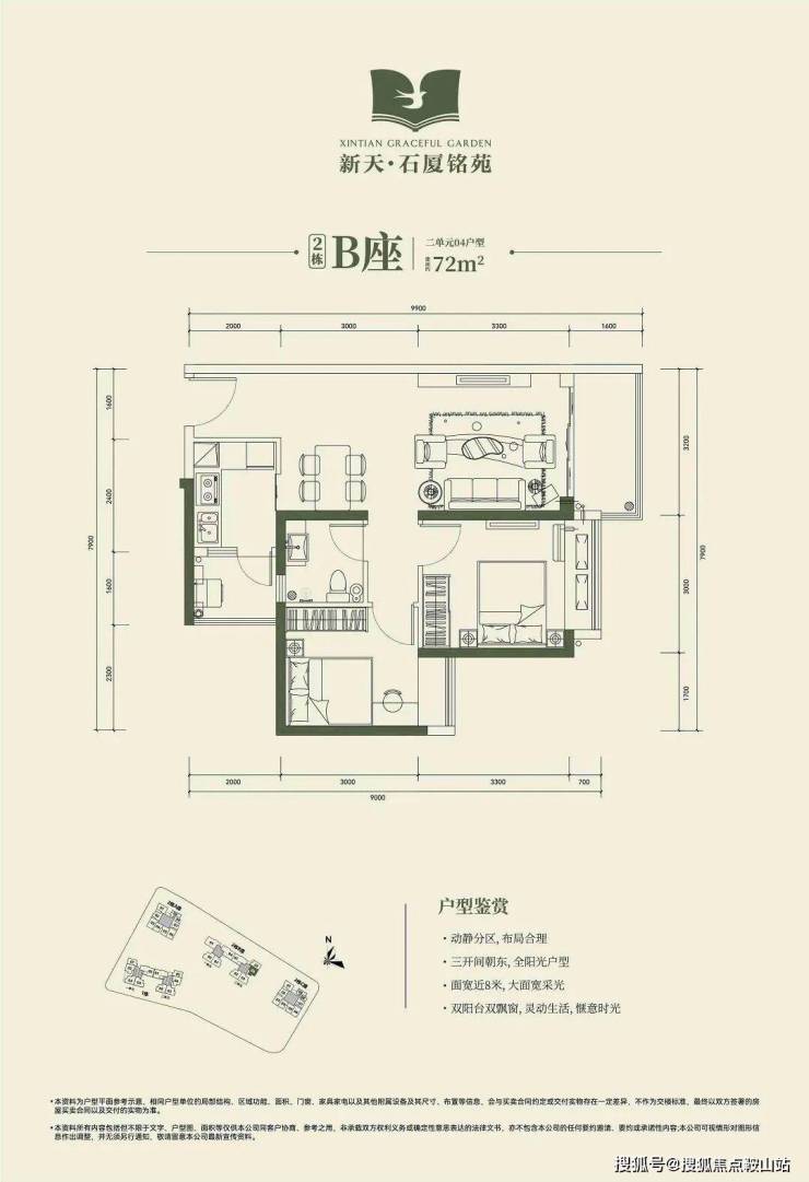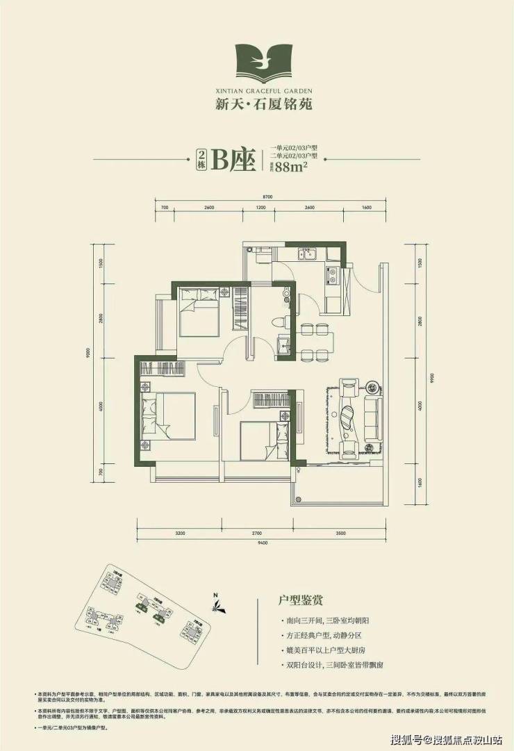 🔸2栋B座一单元02、03户型、2栋B座二单元02、03户型:面积约为88㎡的3房2厅2卫;