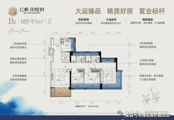 89㎡3房2厅2卫:设计的是经典横厅格局,LDKB一体化,进门入户玄关,客厅带3.5米阳台,U型厨房,主卧南北通透270度景观,卫生间干湿分离。