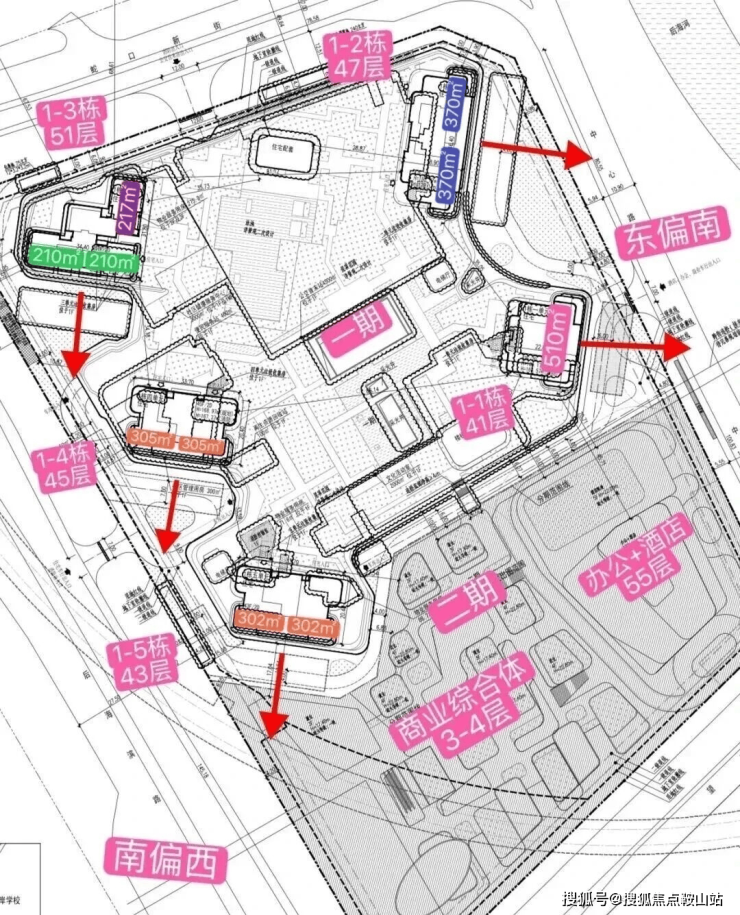总楼层:1-1栋43层、1-2栋47层、1-3栋51层、1-4栋45层、1-5栋43层;