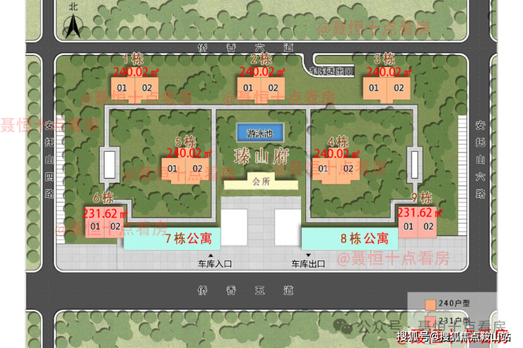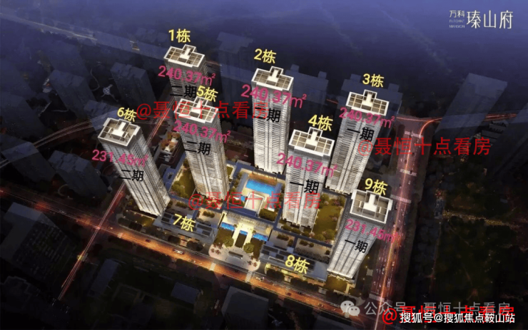 小区一共9栋,其中5栋为开发商自持物业,7栋8栋为公寓。6栋与9栋一共38层;1栋、2栋、4栋一共40层;3栋为41层。小区1楼是架空层,2楼开始有住户,梯户比都是3梯2户,主力户型为231㎡与240㎡的4+1房。