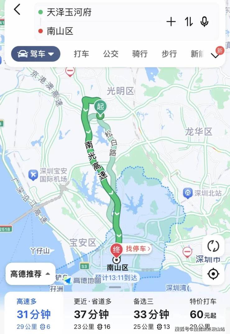 <交通>:另外通过楼下的松白路,一路往南直下,从项目上南光高速,到南山区仅29公里,约30分钟就可以直达南山西丽,留仙洞总部基地,高新园等地方。