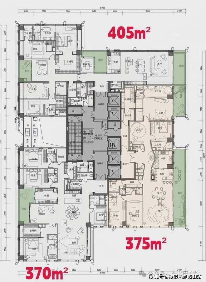 · 370-375㎡户型: 4+1房五卫设计,配备家庭厅和家政套间,适合有多样化生活需求的高净值家庭。