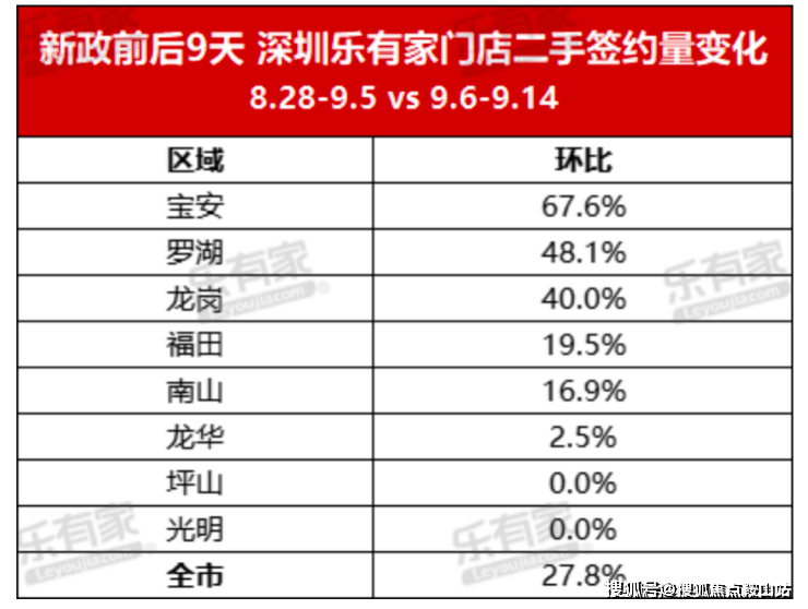 而中介机构则统计了深圳新政后9日的数据,即9月6日~9月14日,全市二手房签约量环比增长27.8%。其中,宝安、罗湖、龙岗的二手房签约量位居前列。