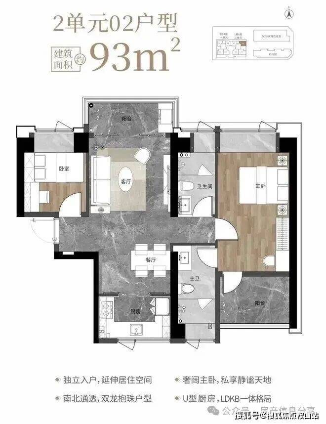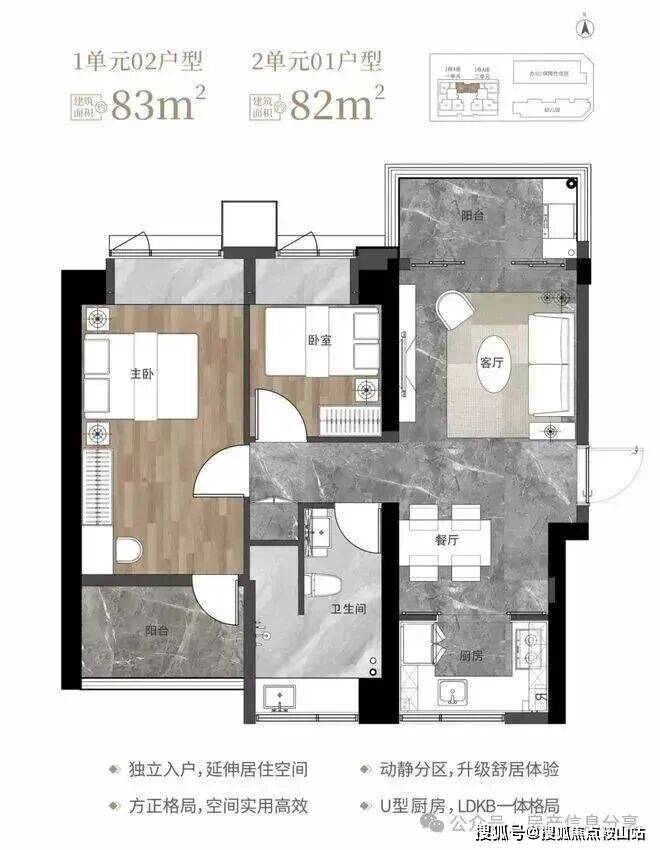 1栋1单元02户型/1栋2单元01户型,竖厅南北通透格局,独立入户,客厅3.2米开间,LDKB一体化设计,动静分区,南北双阳台,U型厨房,卫生间干湿分离,阳台正北朝向。