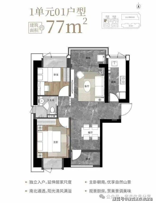 1栋1单元01户型,竖厅南北通透格局,独立入户,客餐厅分离设计,动静分区,南北双阳台,L型厨房,卫生间干湿分离,客厅阳台正北朝向。小户型里面难得可以做到南北通透且有双阳台的格局。