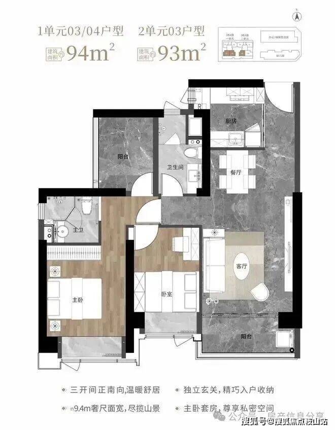 1栋1单元03、04户型/1栋2单元03户型,竖厅格局,客厅3.6米开间,LDKB一体化设计,动静分区,三开间朝南,9.4米面宽,二字型厨房,卫生间干湿分离,阳台正南朝向。