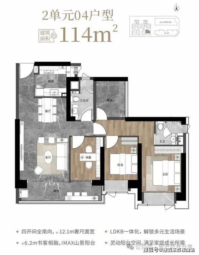 1栋2单元04户型,竖厅格局,客厅3.85米开间,LDKB一体化设计,动静分区,四开间朝南,12.1米面宽,二字型厨房,卫生间干湿分离,客厅连接次卧出6.2米长大观景大阳台,正南朝向。