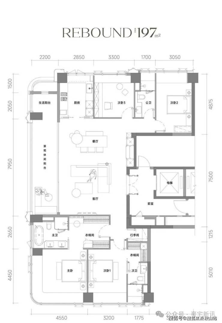 尺度革新:建面约197m²户型,专梯入户设计。户型格局极致方正,动静分区清晰,实现了三面采光与双南向套房的“双龙抱珠”格局。