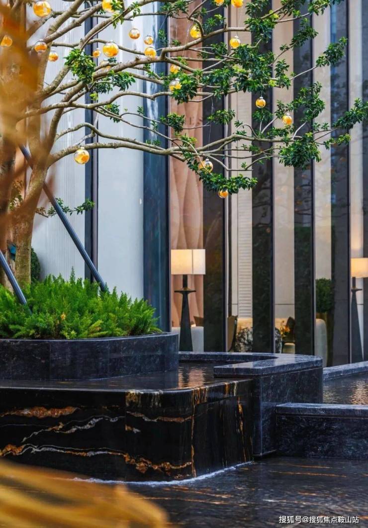 园林内采用了拿破仑黑金、铂金钻等大面高端奢石打造,入户大门两侧跌水入户水景搭配寓意吉祥的铁冬青名贵树种,带来尊贵的归家礼序。