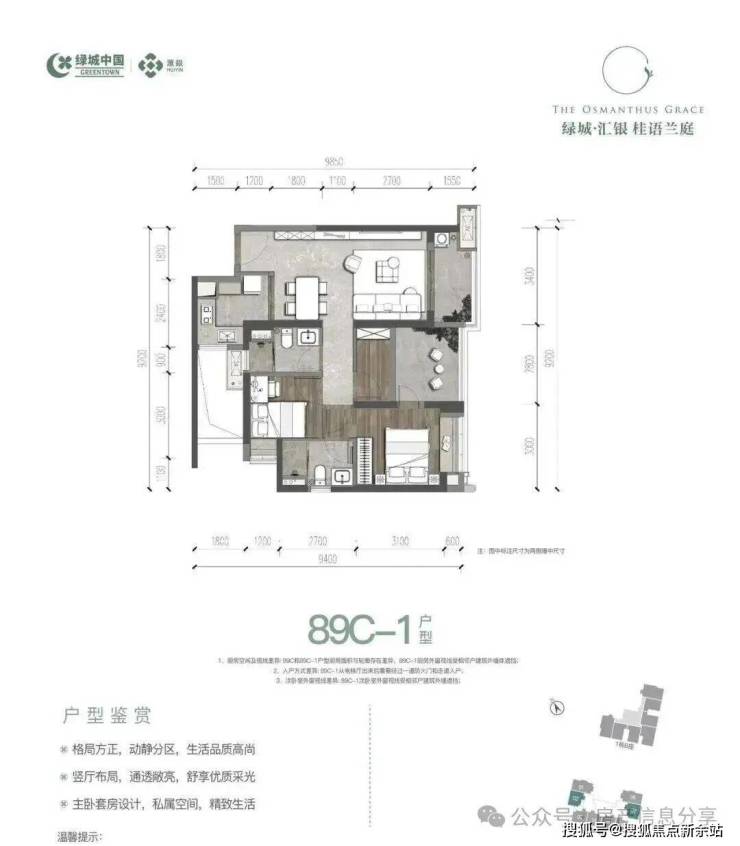 89㎡的3房2厅2卫(二期C-1户型),设计的是经典竖厅格局,客厅3.4米开间约12.92平,LDKB一体化,动静分区,分别做到了主卧12.3㎡/次卧10.36㎡/次卧7.68㎡(包含墙体飘窗),U型厨房,卫生间干湿分离,得房率:72.97%(不含赠送),阳台约5.26平西北或东南朝向。套内面积64.7㎡+赠送面积8.79㎡=实用面积73.49㎡,加上赠送后得房率约82.87%。