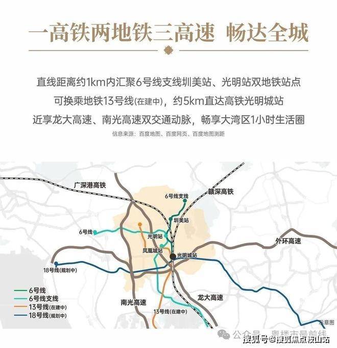 地铁方面,项目直线距离约1km内汇聚6号线支线圳美站、光明站双地铁站点,3站可换乘在建中的13号线(科创快线),30分钟就能直达南山科技园,对于科创人群通勤极为友好。高铁出行同样便捷,约5km即可直达光明城站,快速接驳广深港高铁,轻松实现1站深圳北、2站福田、3站香港西九龙的高效出行。