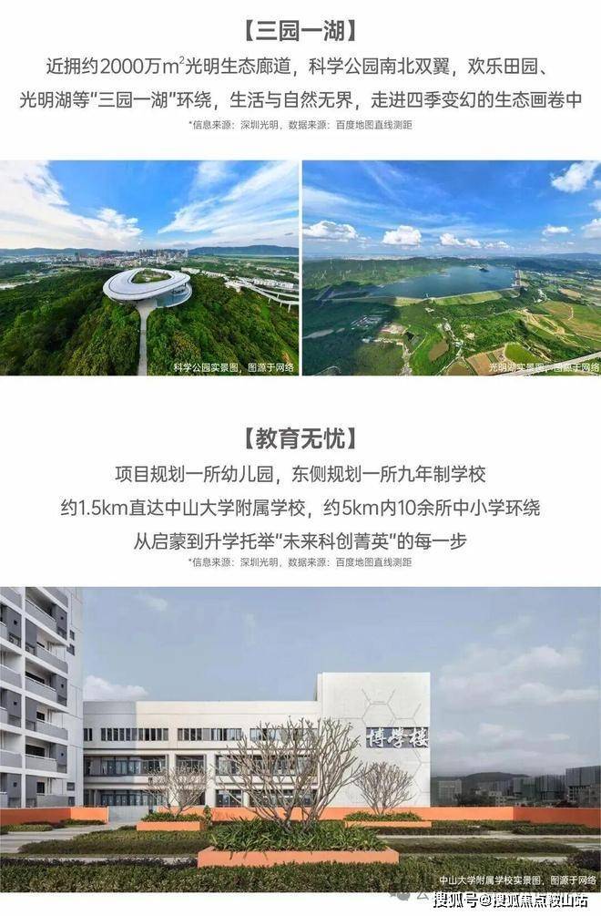 生态环境更是项目的一大王牌。项目西北侧与科学公园北翼紧密相邻,东南侧直面充满田园野趣的光明欢乐田园,周边更有光明湖、约2000万㎡光明生态廊道环绕,形成“三园一湖”的天然生态屏障。科学公园作为光明生态“绿心”,占地约208万平方米,相当于2.7个人才公园,一期已开放的“科学顶”更是成为网红打卡点,居住于此,推窗即揽四季生态画卷,日常休闲散步皆有鲜氧相伴。
