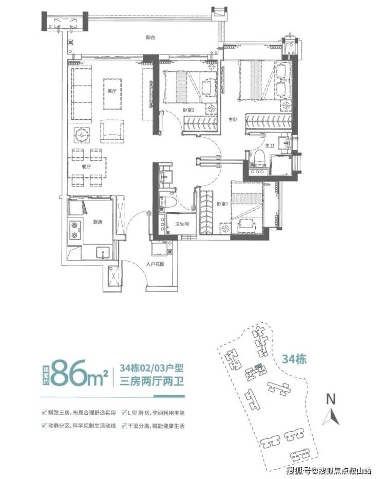 建面约86㎡南北通透三房,南北对流,采光通透,空间视野开阔,布局方正舒适实用,客厅直通南向阳台,引更多清风和阳光入室,缔造质感生活。