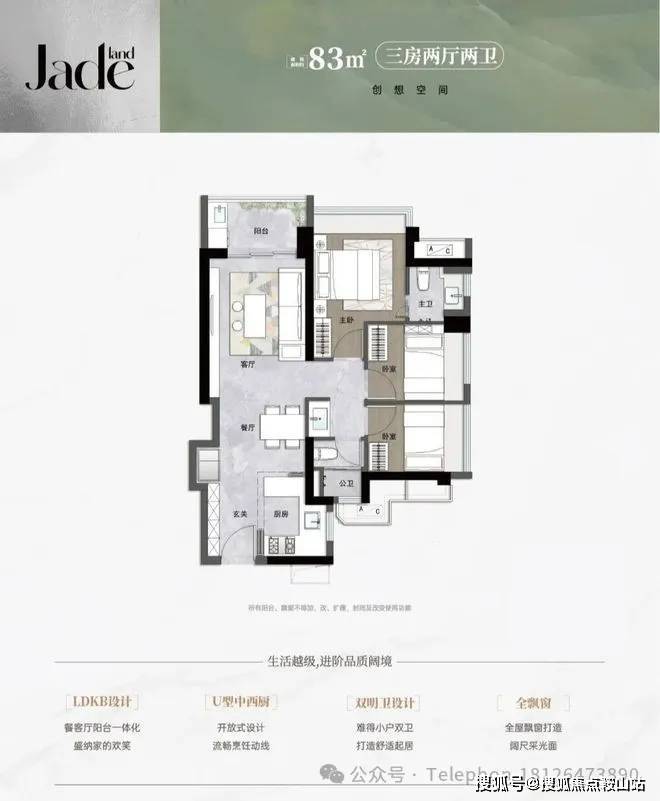 83㎡的3房2厅1.5卫,设计的是竖厅格局卓越珺奕府售楼处电话:400-892-2273,进门入户玄关,LDKB一体化,S墙设计预留冰箱卡槽位,U型厨房,主卫少了淋浴,公卫三段式分离,得房率约92%(包含赠送),阳台西北朝向。