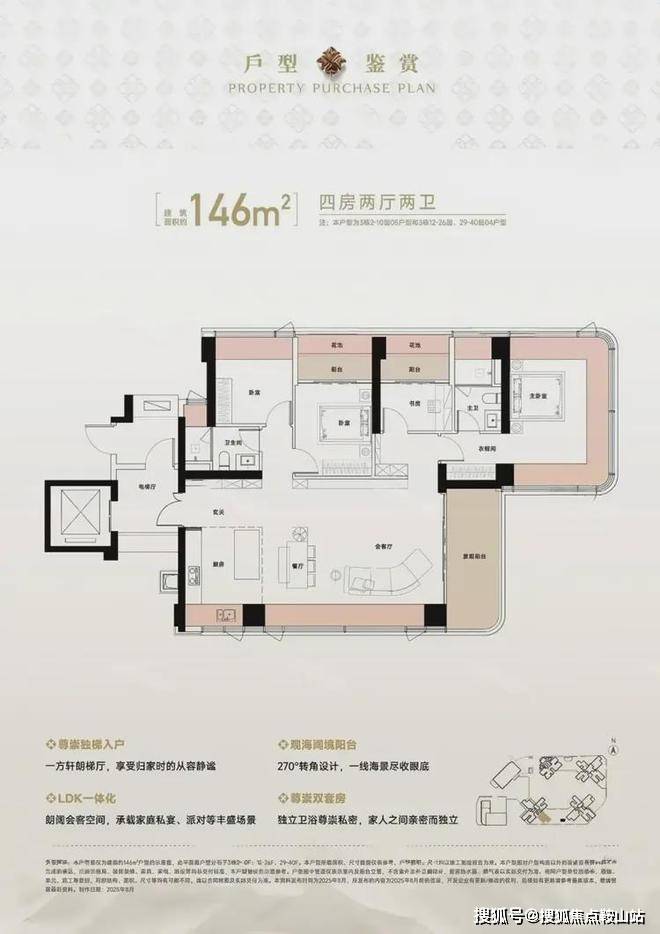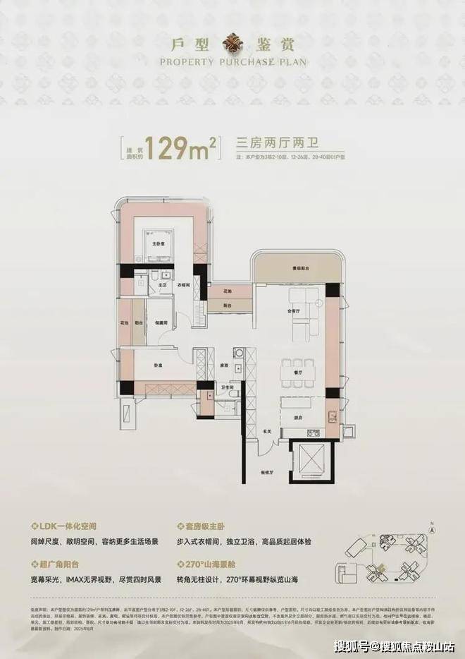 129㎡的4房2厅2卫,设计的是竖厅格局,尊享独立电梯入户,LDKB一体化设计,动静分区,主卧270°无柱转角全景舱,L型厨房+岛台设计,公卫三段式干湿分离,得房率约105%(包含赠送),东北朝向看一线梧桐山景观。