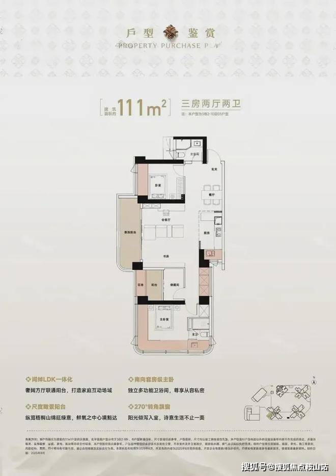 111㎡的3房2厅2卫,设计的是竖厅格局,LDK一体化设计,四开间朝南,主卧270°无柱转角全景舱,L型厨房,卫生间干湿分离,得房率约94%(包含赠送),西北朝向看一线梧桐山景观。