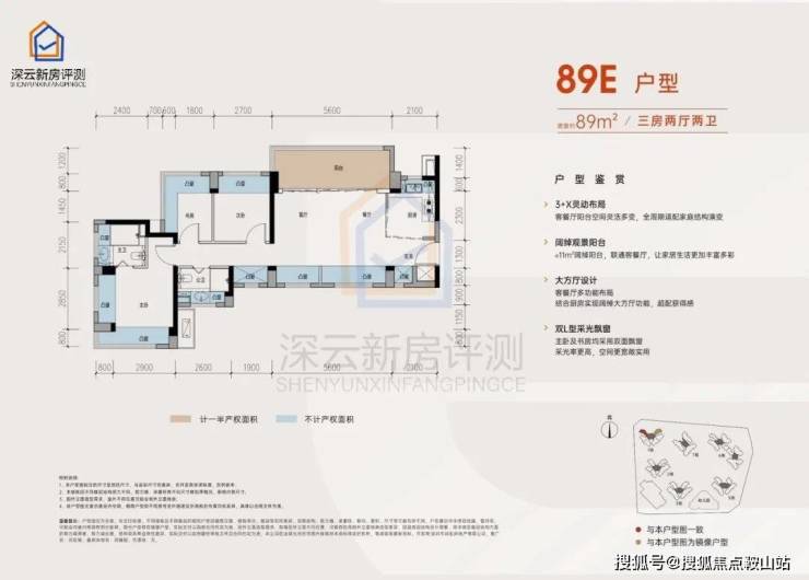 户型亮点:89㎡三房两卫可满足首套刚需置业者,108㎡四房双卫设计,满足三代同住需求。