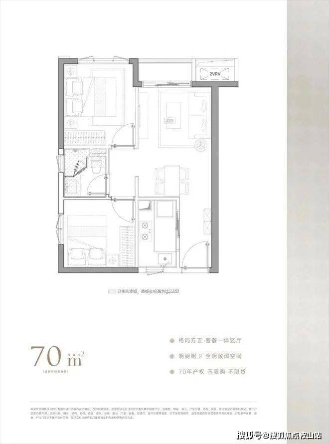70平两房,竖厅格局,全明通透,通风采光及舒适度都是最好的,也比较贴近住宅家庭需求,功能空间开阔,拥有独立厨房和景观阳台。