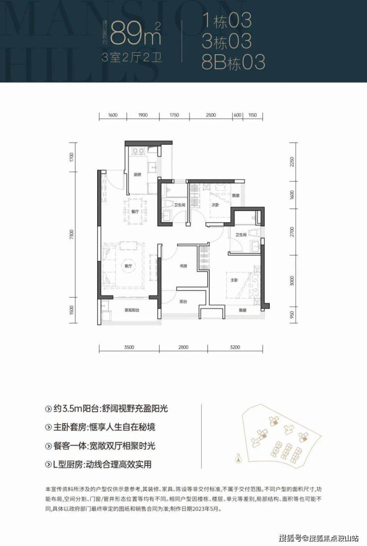 :得房率88%-91%,三开间朝南+6米景观阳台(实得面积约81.8㎡)