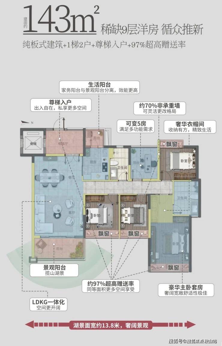 洋房采用纯板楼设计,通透对流,最大化景观视野,目前在售第五期【天岚】,产品为97-167㎡三至五房洋房。