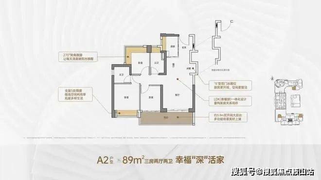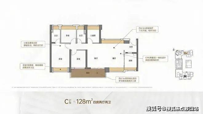 竖厅格局,客厅3.5米开间,LDKB一体化,S墙设计预留冰箱卡槽位,客厅连接次卧出5.9米长的大阳台,主卧双面飘窗,次卧270°转角飘窗,全屋6面飘窗,U型厨房,卫生间干湿分离。