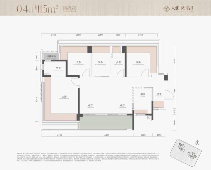 设计的是竖厅格局,客厅3.7米开间,LDKB一体化,客厅双面采光,凹墙设计预留冰箱卡槽位,动静分区,分别做到了主卧20.39㎡/次卧12m/次卧9.3㎡/次卧8.64m(包含墙体飘窗),L型厨房还带1个设备平台约2.86m,卫生间干湿分离,得房率约81.4%(不含赠送),客厅连接次卧出6.4米长的大阳台约11.52㎡,东北朝向。套内面积93.33m+飘窗17.25m+阳台5.76m+设备平台2.86m=实得面积119.2㎡,加上赠送后得房率约103.9%。