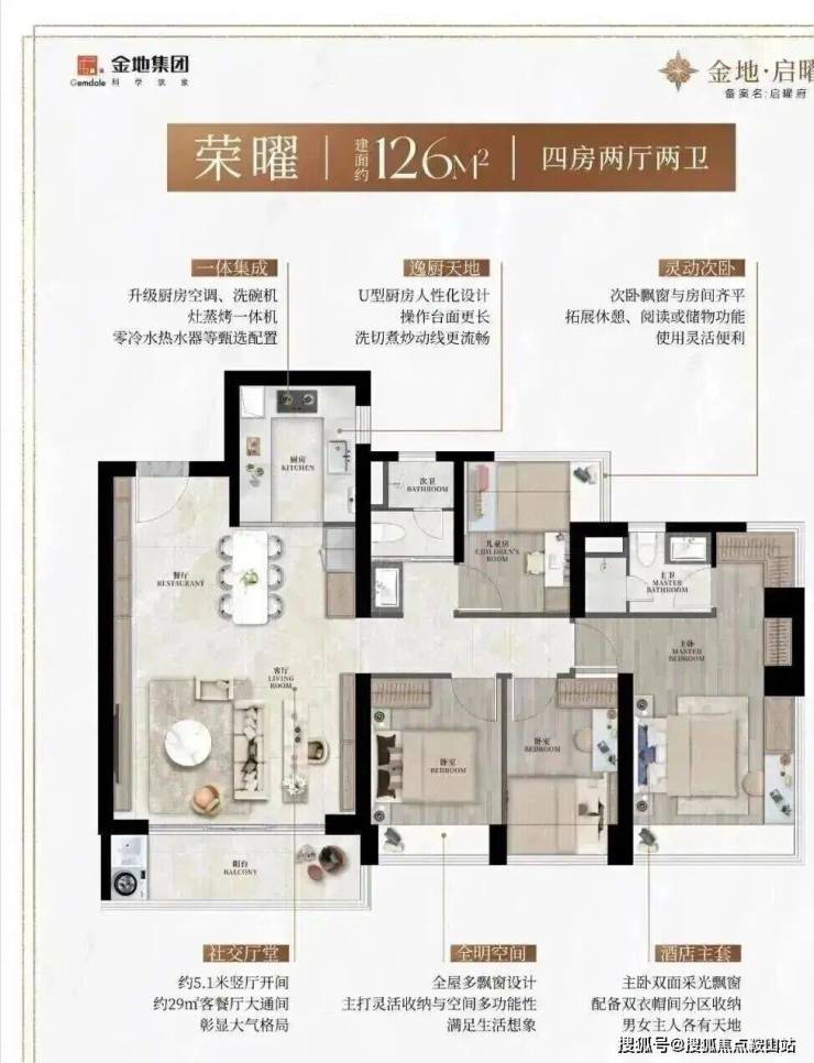 126㎡的4房2厅2卫,经典竖厅,5.1米客厅开间,29平LDKB一体,动静分区,四朝南。主卧270°飘窗,U型厨房,公卫干湿分离。得房率90%(含赠),客厅带5.1米阳台,西南向。