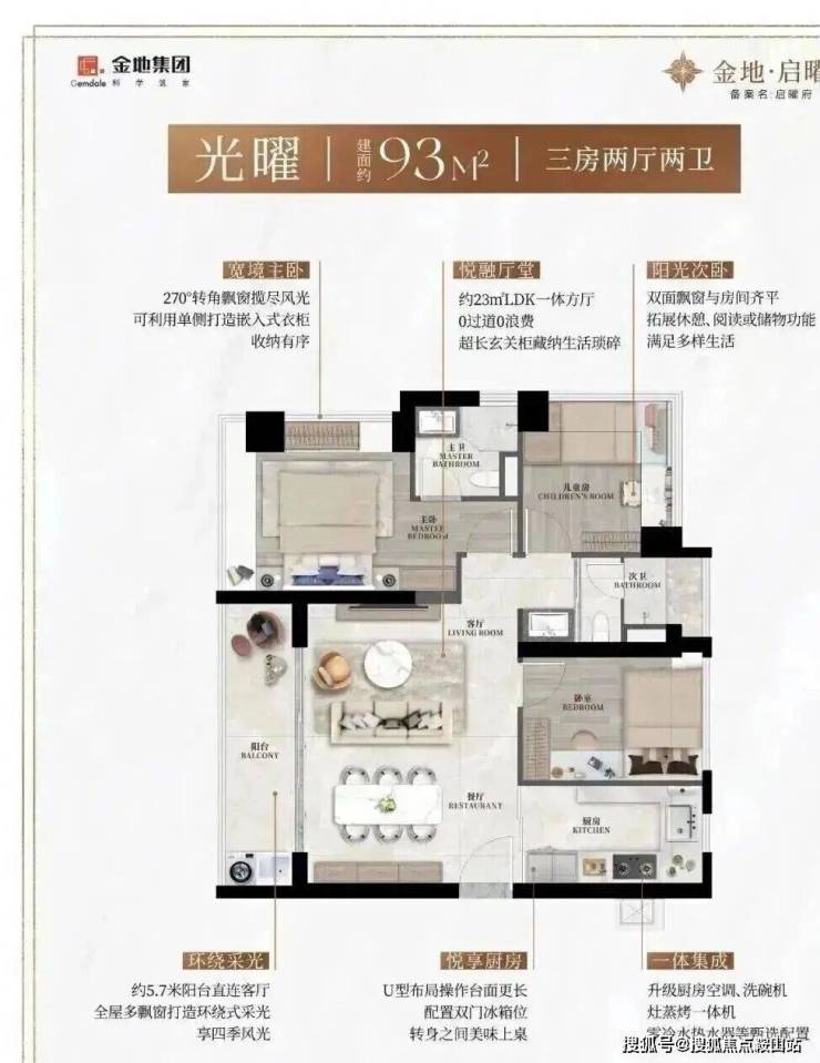 93㎡的3房2厅2卫,2栋1/2/3单元01户型,横厅南北通透,客餐厅5.7米开间,LDK方厅23平,主次卧270°飘窗,U型厨房,公卫干湿分离,得房率约90%(含赠送),客厅连餐厅带5.7米阳台,西南/东南朝向。