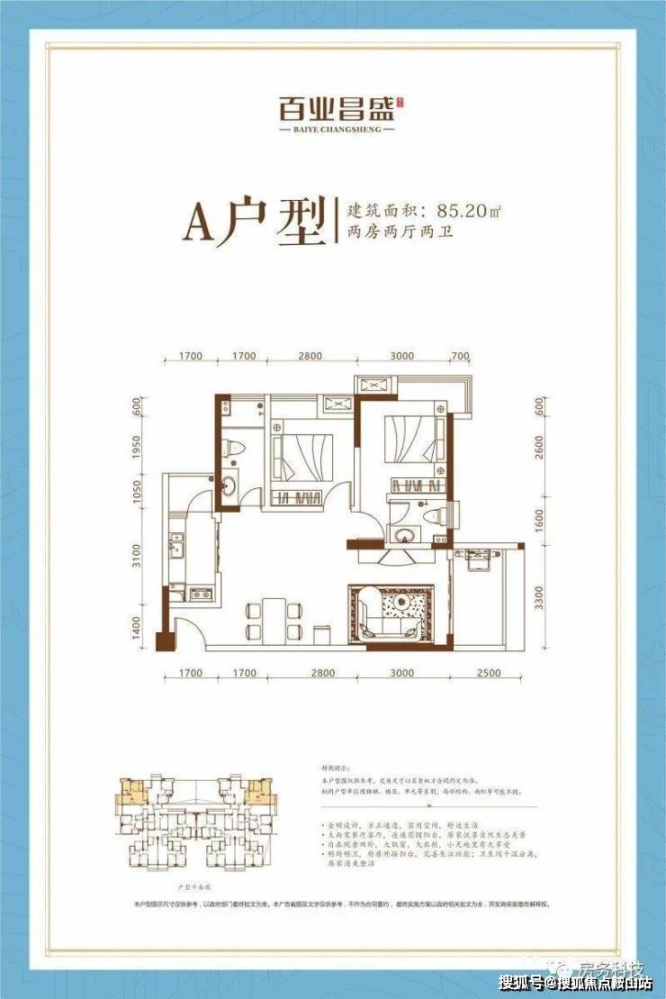 A户型 两房两厅两卫 建筑面积85.20㎡