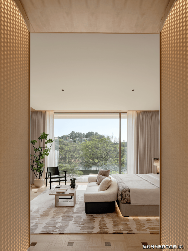 主卧套间的设计安静简约,且优雅隽永——正如设计师在整个创作过程中所坚持的,传统岭南美学的语言得到巧妙转译,和谐融入人们当下的生活。