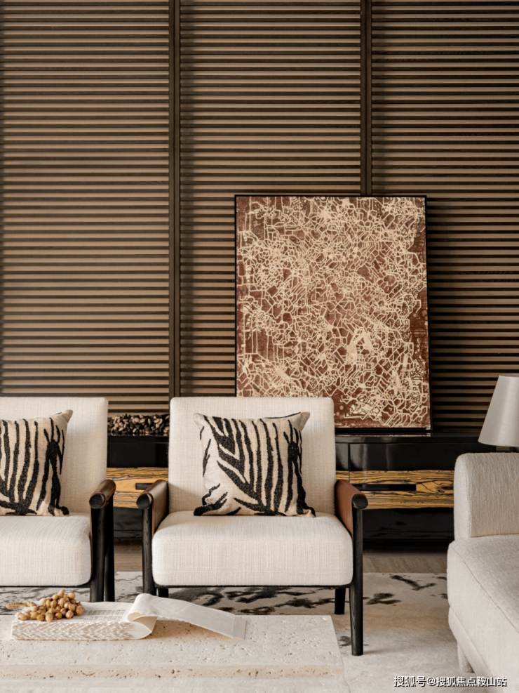 书房一侧的作品《中国式山水》来自艺术家应麦可。设计师为其搭配一把造型独特的转角扶手椅,可容纳双人的尺度,恰好为亲子阅读留出想象力。空间中的每一个角落都可观、可赏,引人细细推敲。