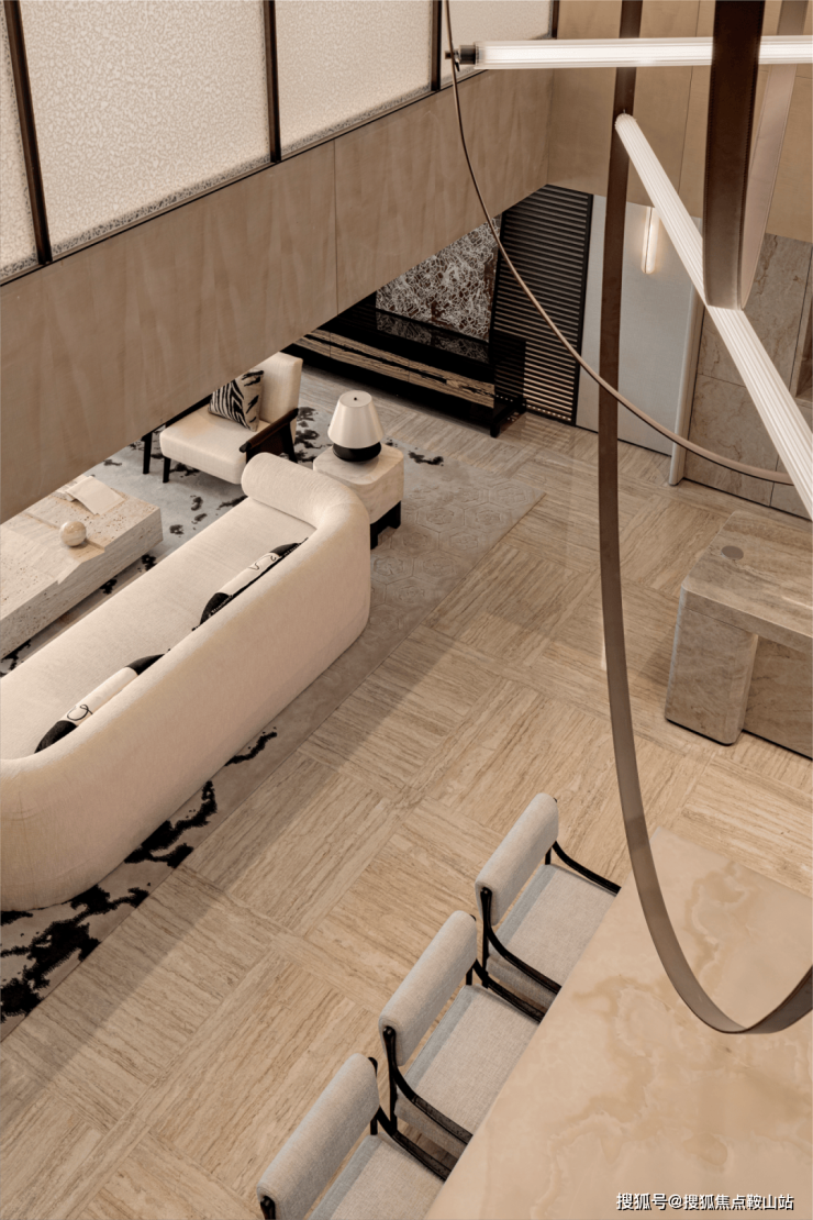 挑高6.1米的会客厅中,转角组合沙发、双人座沙发,以及坐凳与单人休闲沙发呈围合式形态,游刃有余地满足举办派对时的社交需求。