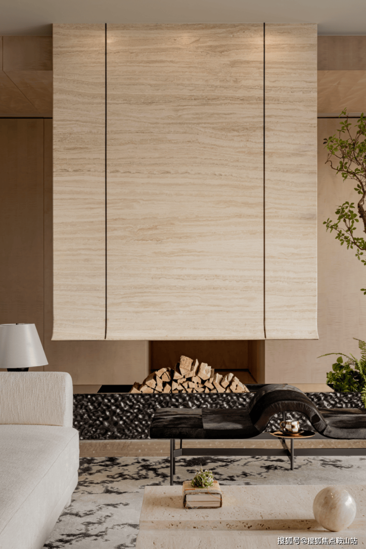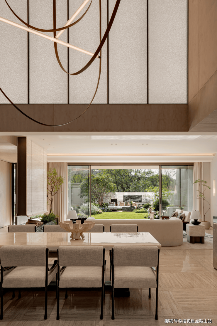 大面积使用的意大利超白洞石,石材的横向纹理与天然孔洞让人不禁触摸、感知;墙壁上的浅色影木木饰面在变换的阳光下反射着微光;餐厅长桌的台面则使用奢石汉白玉,质感温润如玉,呼应湖居生活的主题。