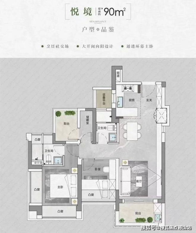 90㎡的3房2厅2卫,设计的是经典竖厅格局,进门入户玄关,LDKB一体化,S墙设计预留冰箱卡槽位,三开间朝南,U型厨房,卫生间干湿分离,还带1个设备平台,得房率约94.1-95.74%(包含赠送),西南朝向。