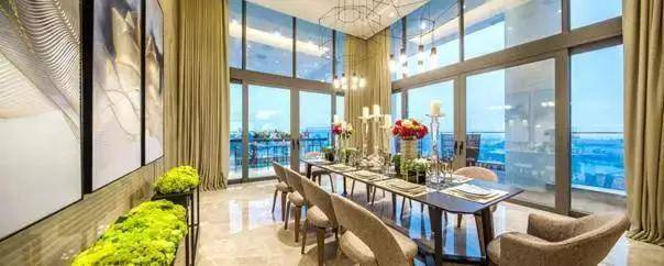 餐厅约5.5m高,墙身使用树枝水晶面板,并选用西班牙灯具品牌VIBIA “光之雕塑”概念吊灯,简约的线性设计,在夜晚下发出点点繁星照耀着整个用餐区。