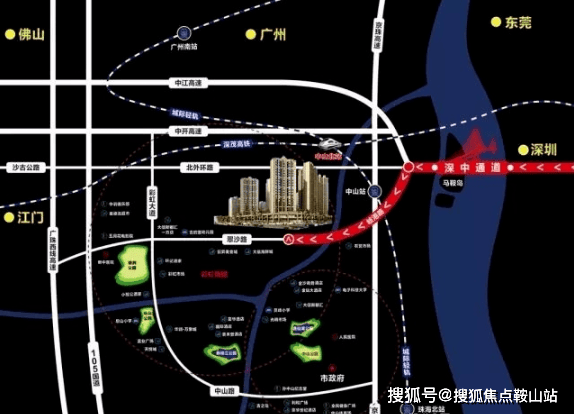 可快速到达中山北站,经广珠城轨快速抵达广州南、珠海;京珠高速快速接驳广州、珠海、深圳;深茂高铁预计2018年开通,经停中山北站,缩短中山与深圳的距离;经北外环直达港口高速出入口,转中江高速接驳深中通道,实现两城一体化。