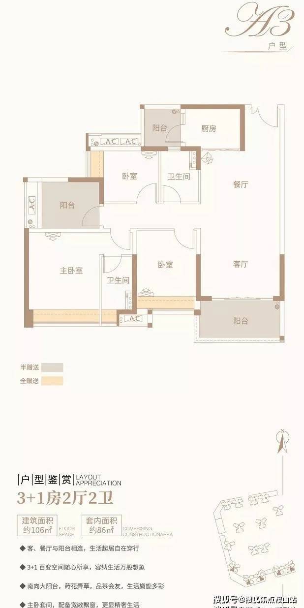③ 3+1房2厅2卫/约106平方米/南向阳台,宽敞客厅