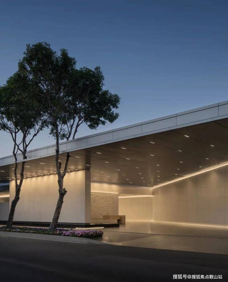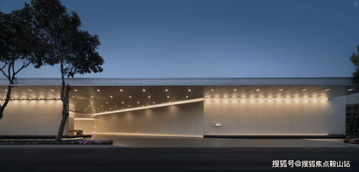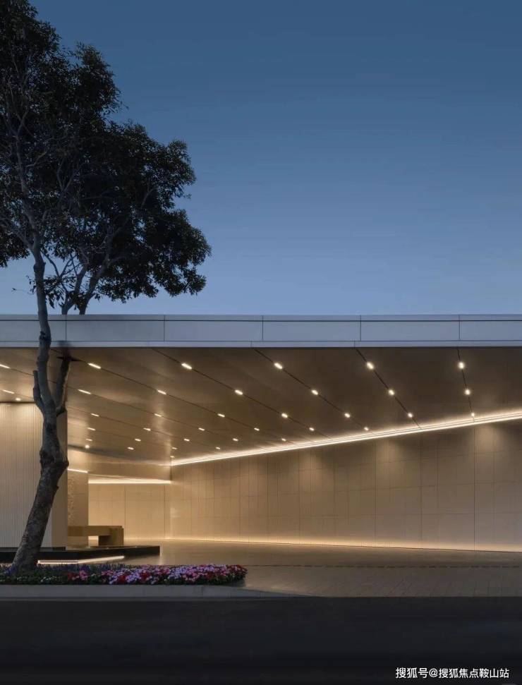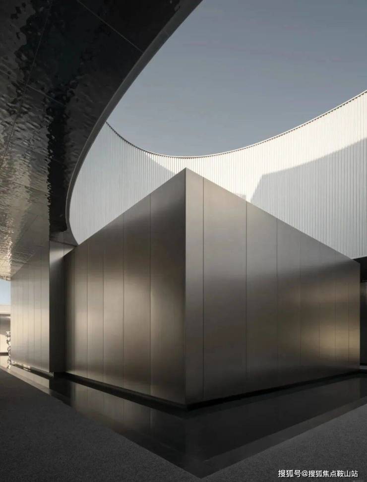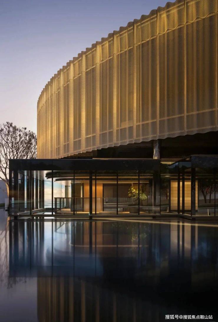 售楼部外立面延续了项目整体的“海浪风帆”曲线语言,采用曲面玻璃搭配铸铝线条,质感通透又极具张力。12米挑高架空+无柱式设计,弱化了建筑与自然的边界,站在远处望去,仿佛一座漂浮在海边的艺术展馆,与不远处的深圳歌剧院形成诗意呼应。