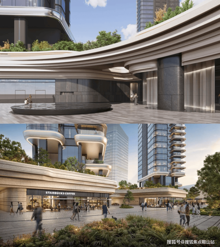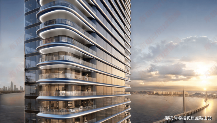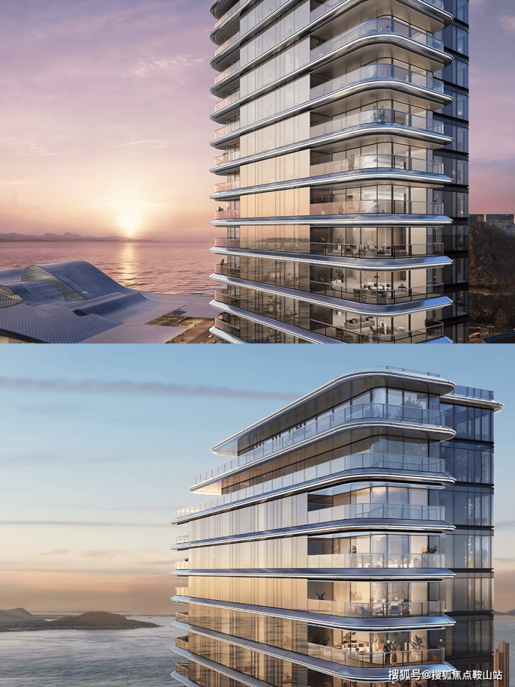 建筑立面以“海浪风帆”为灵感,采用现代极简风格,柔和的曲线造型与深圳歌剧院形成呼应。作为深圳首个采用铸铝工艺的住宅,铸铝幕墙搭配曲面玻璃,不仅质感出众,更兼具耐久性与滨海抗腐蚀性;塔楼海景面采用落地单元式幕墙,最大化窗地比,开启扇为落地平推窗,既优化了观景体验,也提升了通风效果。