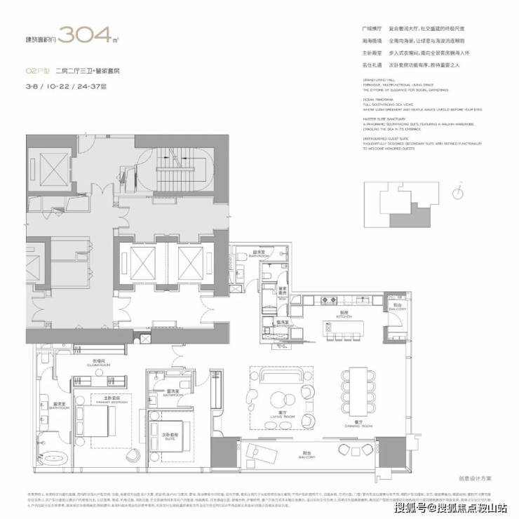南北通透三面采光,顶奢总统套房规格,270°全景套房,享受湿地/公园/CBD景观,都是套房设计,更具私密性,中西厨分离。