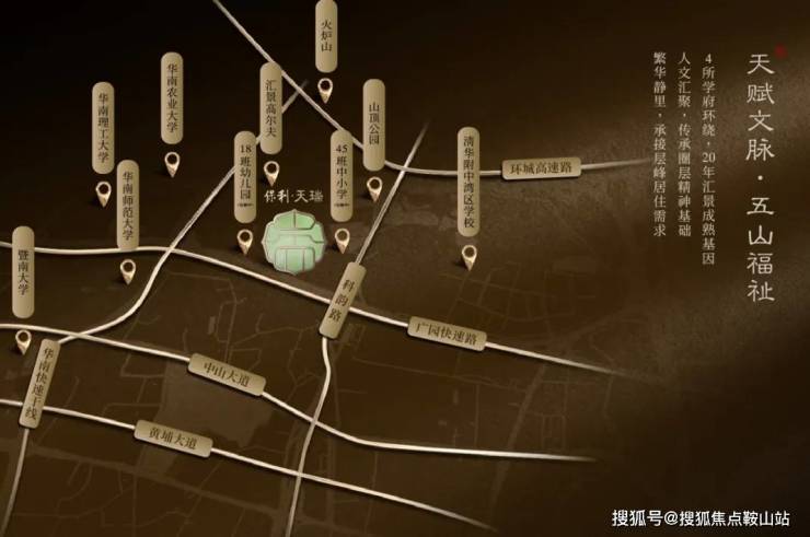 保利天瑞项目诞生于汇景新城板块,这里发展了20余年,保利天瑞售楼处电话:400-892-2273是广州最早发展起来的富人区之一,生态资源,极为稀贵。北侧就是5万m²龙熹山山顶公园,背靠约8万㎡专业级汇景高尔夫球场,还有自身配建的6.8万m²园林,满满的负离子;