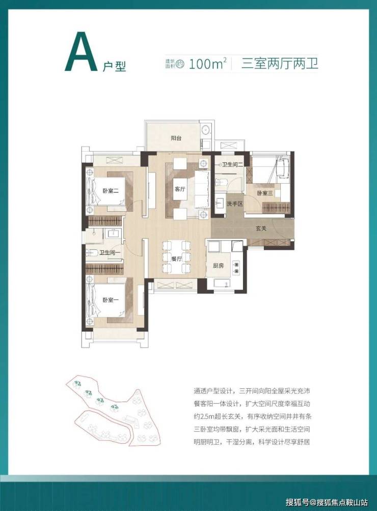 100㎡的3房2厅2卫,设计的是竖厅双龙抱珠格局,餐客厅一体化设计,三开间朝南,U型厨房,公卫三段式分离设计,得房率:79.25%(不含赠送),阳台朝西北或东北向,看山景。