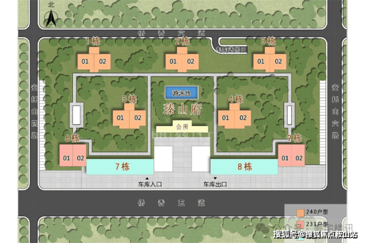 瑧山府共有9栋,共556户,除开两栋商墅外,有7栋高层,都是3梯2户,其中1-2-3-4-5属于240平,6-9栋为231平(分东、西两个朝向)。