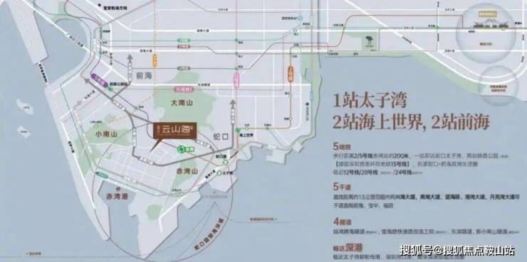 紧邻2号线、5号线赤湾地铁站,2km内还有在建的12号线左炮台站,未来还有地铁28号线规划,自驾走小南山隧道,能快速到前海、后海、宝安。