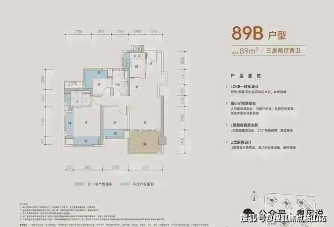 89㎡的3房2厅2卫,B户型,设计的是经典竖厅格局,进门入户玄关,客厅3.5米开间,三开间朝南,,主卧+1个次卧270°飘窗,3个卧室分别做到了主卧15.1㎡/次卧8.52㎡/次卧7.77㎡(包含墙体飘窗),得房率约:77.39%(不含赠送),西南朝向。赠送面积16.96㎡,加上赠送得房率96.84%。